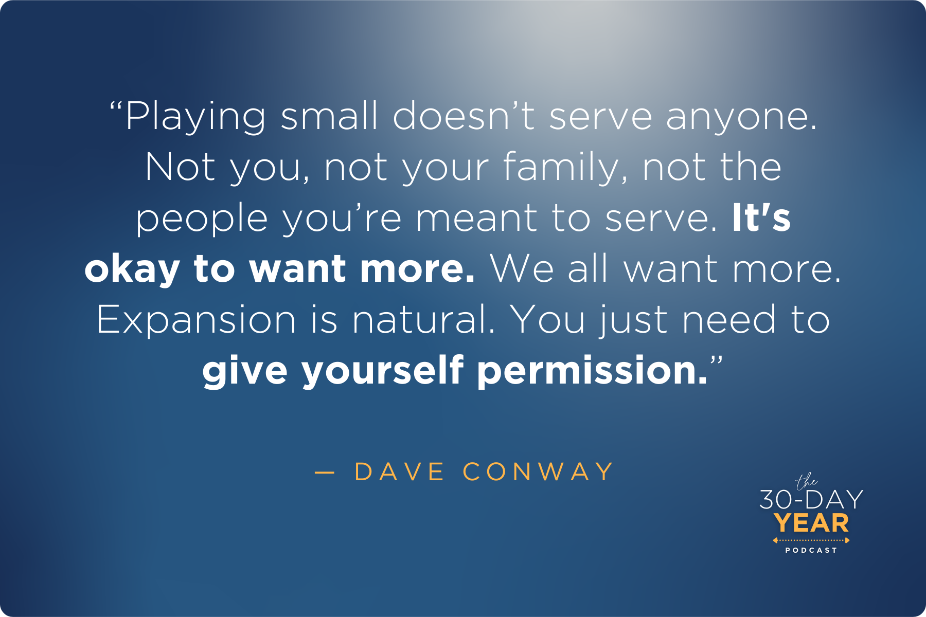 In this episode, Dave and Jacq Conway explore why so many people struggle to give themselves permission to want more. They unpack the three major blockers that keep people from pursuing ambitious goals: fear, money, and guilt. For many people, wanting more is somehow wrong. But Dave and Jacq show us that this is simply not true. In fact, recognize that nobody benefits when you play small. On the contrary, just think of how many people's lives will improve when you courageously pursue your potential!